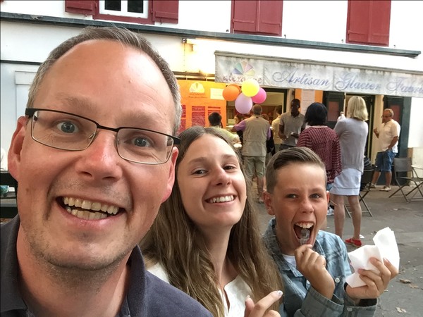 Vi hittade en Zara som var öppen och hade rea, så det blev lite nya kläder till barnen, och en macaron innan vi hoppade in i bilarna och åkte tillbaks till Frankrike igen. Där blev det bad på ytterligare en ny strand Uhabia innan vi tog en middag i Urrugne som låg jättenära där vi bodde. Mormor och Morfar hade sett restaurangen när de gjorde liter egen sightseeing dagarna innan, men den restaurangen var inget att hurra och när jag slog upp den efteråt i Tripadvisor-appen så såg jag att de höll med mig. Maten hade varit ok, om den hade kostat hälften, nu var det inte prisvärt och servicen var inte speciellt bra heller så är ni i Urrugne så välj en annan restaurang än Auberge Chez Maîte.