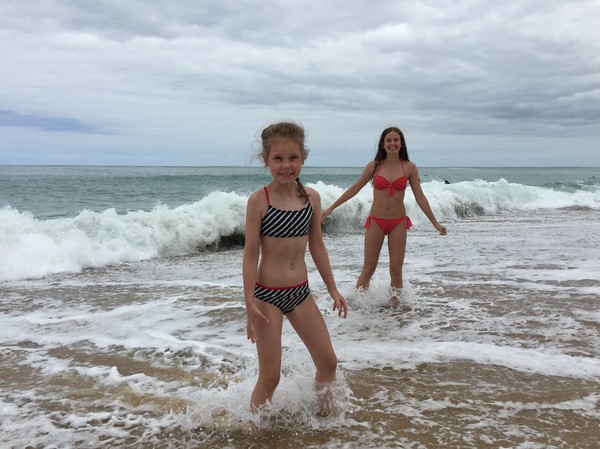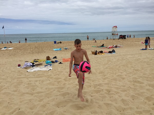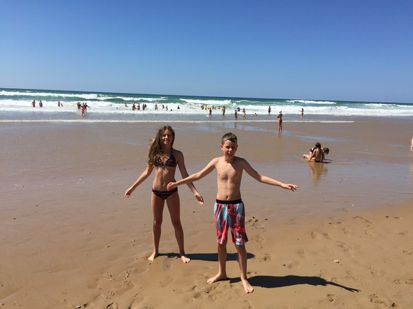 Väl nere påminde den väldigt mycket om en strand nära San Diego som vi besökte med grannarna för tre år sedan, höga klippor på bägge sidor. Skillnaden var att det var högre vågor, bättre än i Hossegor visserligen, och vi blev ihoptryckta på en smal remsa med hundratals andra badande. Så det gick inte att bodysurfa säkert och till och med att bara glida med vågorna garanterade att man var tvungen att väja för någon annan. Trist, men kanske gör de så för att garantera säkerheten. Det är verkligen rejäl kraft i vågorna.