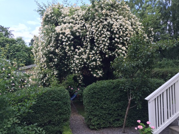 Sitter på landet, ute på framsidan under parasol och lyssnar på (o)ljudet från spelande barn och vuxna inne i huset. Samtidigt som det är blå himmel på många ställen kommer små stänk från himlen.