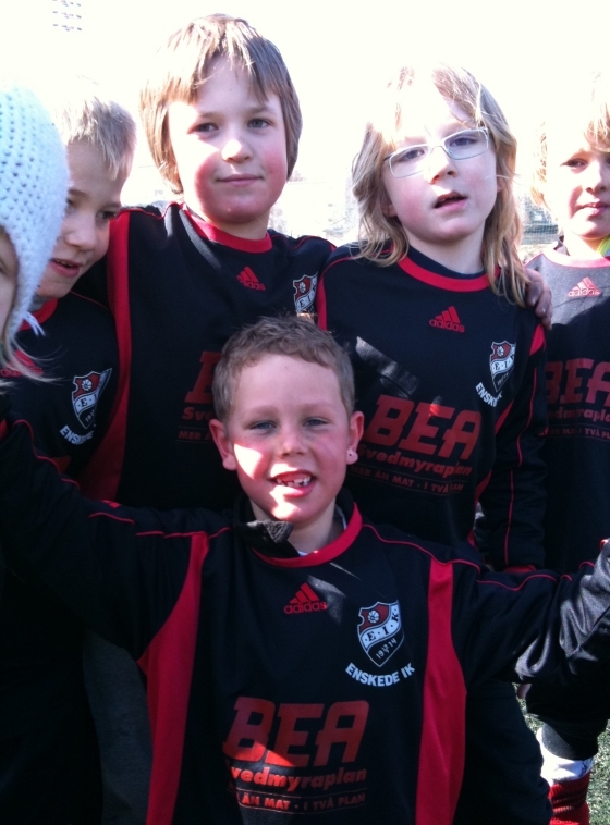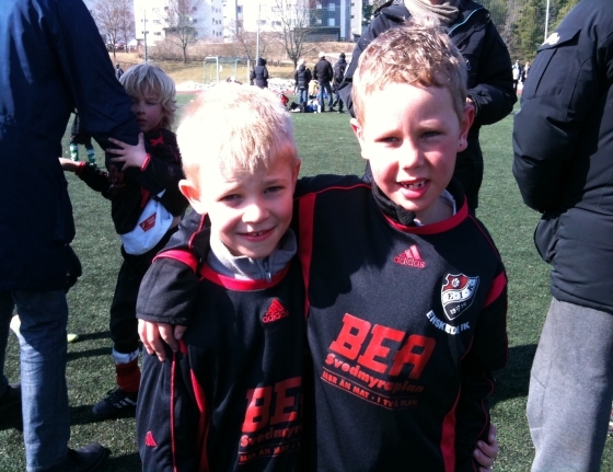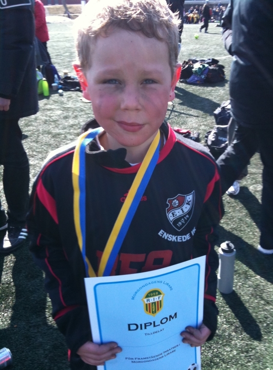 Så här fortsatte dagen och det blev en massa matcher både som ordinarie i sitt eget lag och inhoppare i andra lag. Inför sista matchen vill vi att Sander skulle ta det lugnt eftersom han var helt slut och fått en rejäl smäll i matchen innan. Han vägrade dock och var rejält revanchsugen. Så han blev inbytt i sista matchen och han och hans kompis Simon sprang till dess att benen inte orkade mer och sen sprang de lite till. Sander sprang igenom hela motståndarlaget och gjorde ett vackert 3-1 mål, men sen föll Enskedes spel ihop och sista 5 minuterna så var det spel mot ett mål. Tack vare otroligt målvaktspel och en uppoffrande Simon så klarade Enskede 3-2. Jag var en lugn och tyst fotbollspappa, eller nja.....Rejält uppjagad nästan varenda match gjorde jag allt för att lägga band på min entusiasm. Inte lätt.