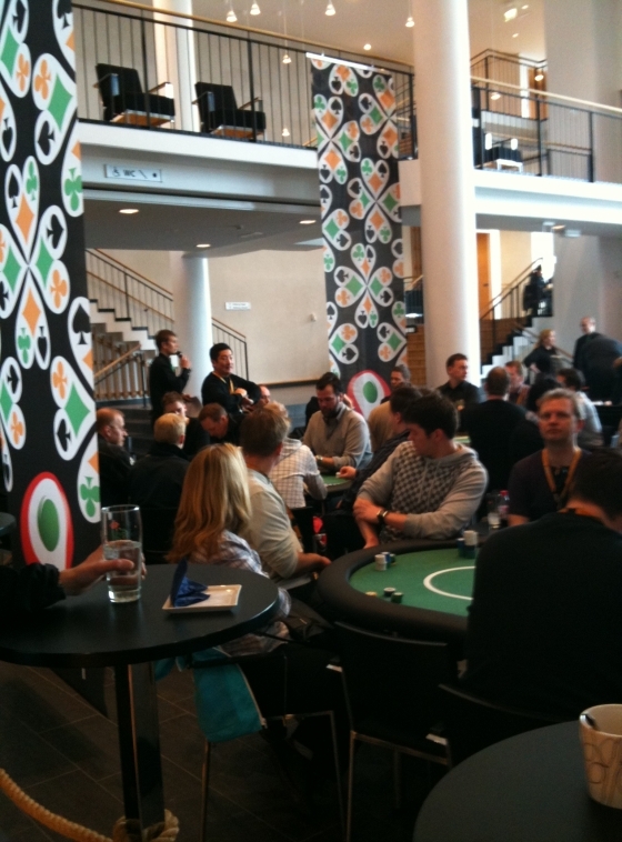 Vi tog en snabb lunch och sedan var det dags att börja spela. Satt på ett bord med 8 finnar och 1 svensk. Bestämde mig för att börja lugnt, men det började bombas rätt friskt direkt. Mitt emot mig satt en kille som såg rätt ung och han spelade ganska många potter och visade upp både rena bluffar och monsterhänder som AA.