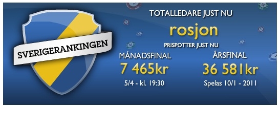 Vet fortfarande inte hur jag ska kunna klämma in Sverigerankingen onsdag och fredag kväll, vi får se hur det blir med det. Ligger fortfarande på fjärde plats sammanlagt och det krävs inte så mycket för att gå upp i topp. Men lite livepoker nån kväll med kollegorna under resan vore ju kul