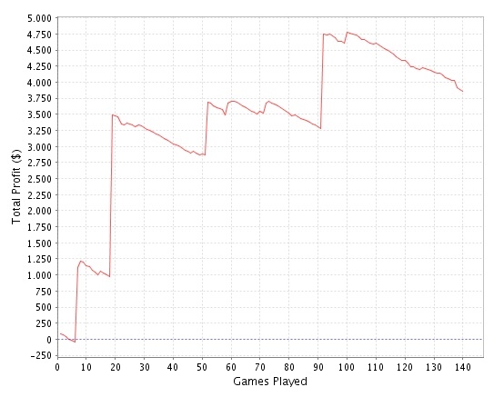 Foldade 5 händer och spelade efter det en hand där jag limpade in med 4s4h efter ett antal limpare, vi blev 5 i potten totalt. Träffar 4 på floppen, som tyvärr var helt i klöver. Jag betar ut 200, och får en syn. Turn kommer ruter 7 och jag tittar på vad killen har kvar, 800 kanske. Så jag betar lite mer än vad han har kvar och han lägger sig. Inte speciellt bra spelat, om han hade färgen hade han synat, men nu i efterhand inser jag att det är tveksamt om han synat med något annat som jag slår. Jag hoppades dock att överbetet skulle se lite bluffigt ut och jag skulle få betalt p.g.a det. Tror inte det var rätt spel.