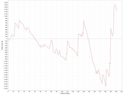 Javisst blir variansen större på detta sätt, men jag tror ändå att det är så man faktiskt vinner pengar i långa loppet. Precis som du gissar ligger min ITM% på strax över 10%, men av dessa så är en stor andel placeringar djupt in i pengarna. Säkert inte optimalt borde kanske ligga på 15-20% istället, borde kanske spela lite försiktigare, men 40-50% är alldeles för högt om du vill öka din bankrulle snabbt. Jag förstår din tankegång helt och fullt, och spelar man för nöjes skull och inte bryr sig om hur mycket man går plus då är det antagligen ett spelsätt som passar. Mycket speltid för inköpen.