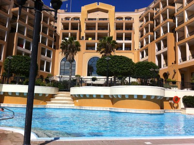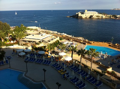 Härligt klart vatten, med casino Dragonara på udden precis mitt emot vårt hotell. Där spelade vi våra enbordsturneringar.
