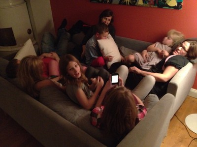 När det blev sent så började Signe krokna, jag gick upp och la henne. Då passade resten av sällskapet på att göra en "dubbel-soffa", ett bregrepp hos oss som består av att man slänger ut soffbordet från vardagsrummet, kör ihopa våra soffor och sedan trängs alla i denna soffbåt.