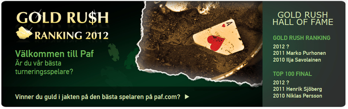 Igårkväll blev det iaf Goldrush, första turneringen på ett nytt år och det lär bli ett sjukt bra år med mycket övvervärde. Vet att jag gör en del reklam för PAF, men det är för att de förtjänar det ( att värdet ökar ju fler som spelar kan ju också ha med det att göra). Igår var det 218 som startade och det ger bra extra värde till kommande årsfinal och månadsfinal. Tyvärr bubblade jag månadsfinalen, blev 12:a, var ganska kortkall hela turneringen, hade tur en gång med 99 mot QQ, med en nia på rivern, vilket gjorde att jag fick så pass mycket stack att jag kunde stjäla mig fram till sista handen. Då drog jag in stegen mot min motståndares kåk, önksar jag lagt den och glidit in i månadsfinalen, men så går det ibland, jag hoppas att Pokerpappa76 blev tacksam iaf. Jag får ta min plats nästa gång......