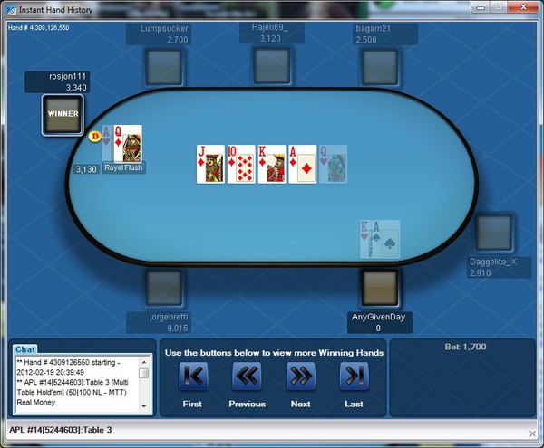 Och just det. lyckades klonka en plats i nästa APokerLeague månadsfinal, eller i vart fall är den ganska trolig. Bonusplatsen går till den som har bäst hand och jag drog in en Royal Flush igår under turneringen, visserligen användes bara ett av mina hålkort så om någon får en Royal med bägge sina hålkort så tar jag mig inte till final, men jag hoppas på turen: