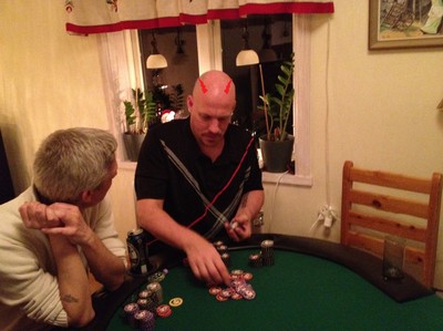 KB (pokerdjävulen reinkarnerad?), som på bilden ovan staplar mina marker tog en välförtjänt andra plats, men vann gjorde till sist Tessans bror, som hade en ännu bättre kväll, han sopade dessutom rent vid cashgameborden efteråt.