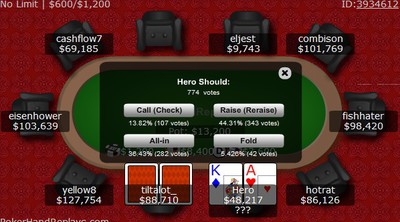 44% valde istället reraise som alternativ. Jag tar för givet att man inser att en läggning om han går allin efter vår är omöjlig. Jag tror att detta egentligen är det bästa valet då vi får mer värde ur hans svagare händer på det sättet. På detta sätt så ger vi honom lite upplevd men ej verklig chans att vi ska folda som kan få honom att ställa även med den lägre delen av hans urval.