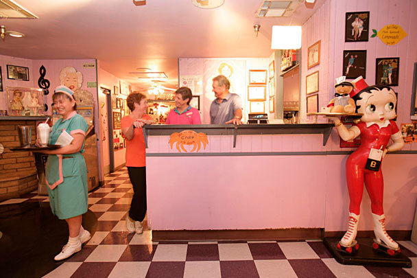 Den sena lunchen intogs på 50-tals inspirerade Route 66-haket Peggy Sue's Diner. Där fick jag min Icecream Soda och ungarna fick shakes där "slatten" som inte fick plats i glaset kom med sidan om i ett mixerglas av rostfritt stål. Jag, som tydligen är gift med Ove Sundbergs före detta fru, fick se Liv beställa mineralvatten, bara för att sedan glupskt dricka upp det barnen lämnade. Ett riktigt prisvärt ställe med god chili och goda hamburgare, och framförallt stora och sjukt goda milkshakes. Testade aldrig efterrättspajerna, men de såg riktigt bra ut.