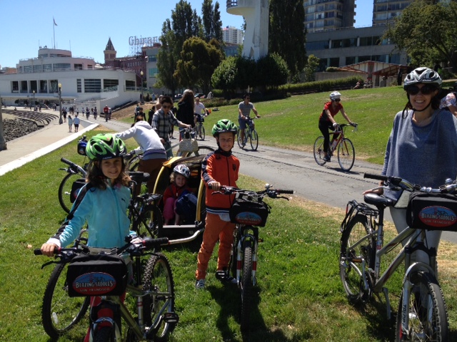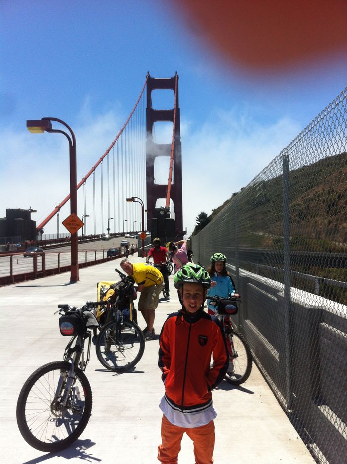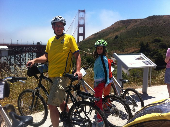 Vi hade bestämt oss för att cykla över Golden Gate-bron, så vi tog F Market & Wharf Streetcar till Pier 39 och hyrde cyklar av Blazing Saddles. Fyra stycken plus en vagn till Signe. Fanns barn-vuxen tandem också, och Signe har ju kunnat cykla ett par år redan, men det var ett bra val för det blåste rejält på bron och till och med våra äldre barn tyckte det var jobbigt. Först en bild vid starten av cykelleden. Många cyklade, så det var egentligen bara att följa strömmen, men man fick en bra karta och anvisningar där vi hyrde.