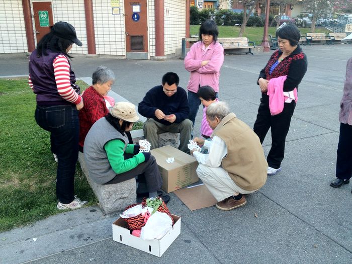Efter maten fortsatte vi vidare mot Portsmouth Square som är en central punkt i Chinatown och vi stötte på flera liknande gäng som de på bilden nedan, som trots kylan satt ute och spelade nån sorts kortspel om pengar, som gömdes mellan omgångarna i lådan bredvid en av tanterna som spelade. Fyra deltagare och många åskådare, försökte fråga om vad det var för spel, men ingen pratade någon vidare engelska. Alla kort delades ut till de fyra deltagarna som sedan la ut korten i tur och ordning, antingen ett i taget, alltid högre än det förra om det inte var ett A, som verkade betyda att det var ok att börja om med t.ex. en tvåa. De la ibland ut flera kort i form av pokerhänder verkade det som. Stege las ut följt av en kåk, och det verkade som om man skulle bli av med sina kort så fort som möjligt. Någon som kan gissa sig till vad det var för spel?