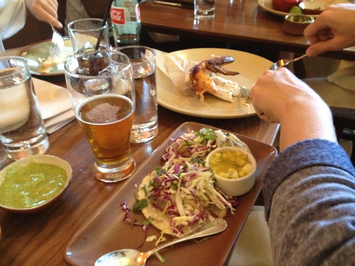 Vi hittade en mexikansk restaurang så fort vi parkerat cyklarna vid färjan, och ölen smakade extra gott tillsammans med våra tacos.