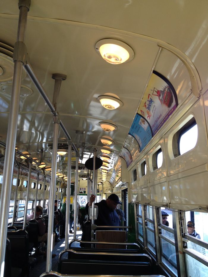 "Hemma" igen i SF, så tog vi spårvagnen hemåt, gamla coola spårvagnar (kolla bara inredningen och lamporna) som är överfulla från Fishermans Wharf, men det tunnar ut ju närmare vi kommer vårt hotell. Signe började vinka och gestikulera i bakfönstret åt en spårvagnsförare som körde en vagn efter vår och när jag och Signe hoppade av vid vårt hotell och stod och väntade på grön gubbe kastade spårvagnsföraren ut en gigantisk godispåse till henne när spårvagnen åkte förbi. Vi vinkade och tackade, sånt händer oftare i USA än hemma känns det som. Amerikanarna känns givmildare, artigare och mer tillgängliga än oss svenskar, samtidigt som de känns mer byråkratiska och regelstyrda. Ett enigma.