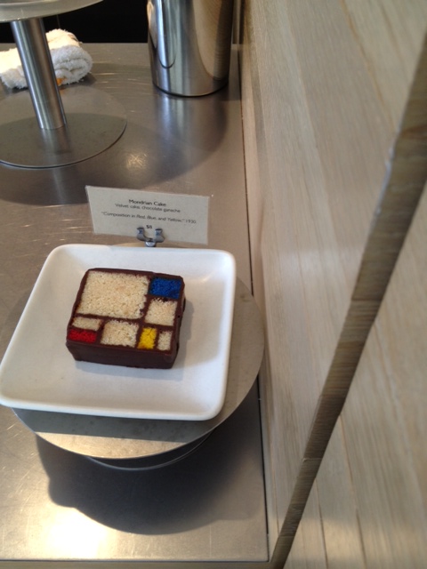 Vi tog sedan lite billiga mackor på fiket i museet, högst upp på taket, där de hade en trädgård. De hade också en speciell kaka, en homage till konstnären Mondrian.