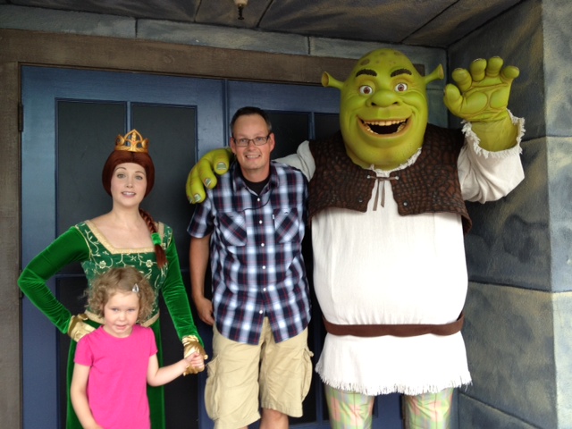 Sedan var det mat och rundturen som numera inkluderar King Kong 360 3D, som var det coolaste ( och det var värt att åka bara för den) med den rundturen, som iofs var intressant, men nu började man få höga krav p.g.a de tidigare åken. Det var dessutom rejält varmt nu, 28 grader i skuggan, så vi smet in på Shrek 4D allihop som hade AC, men trots att hon klarat King Kong, så tyckte Signe att spindlarna där var alldeles för läskiga, vilket slutade i illvrål. Liv tröstade, men sen när filmen var slut och vi skulle gå ut, rörde en av trådarna under stolen (som använts för att smulera spindlar under föreställningen, genom att fladdra mot våra ben) vid Signes fot på vägen ut, vilket resulterade i ett gallskrik utan motstycke.Trött somnade sedan Signe och vi använde våra pass till att åka Simpsons igen. ungarna åkte två gånger och jag en.