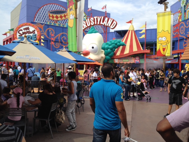 En aning skillnad i antal besökare jämfört med morgonen, det hade börjat tjocka på sig vid 11.00, och nu var väntetiderna bl.a 75 minuter på Transformers utan pass, och 45 minuter för Simpsons. Efter dessa två åk var alla verkligen trötta, men ändå gick Liv, Siri och Sander på House of Horrors, vilket tydligen var sjukt läskigt. Eftersom jag hatar att bli skrämd på det sättet (Liv brukar smyga ner efter mig när jag går ner i källaren, bara för att få nöjet att skrämma slag på mig) så höll jag mig hos Signe.