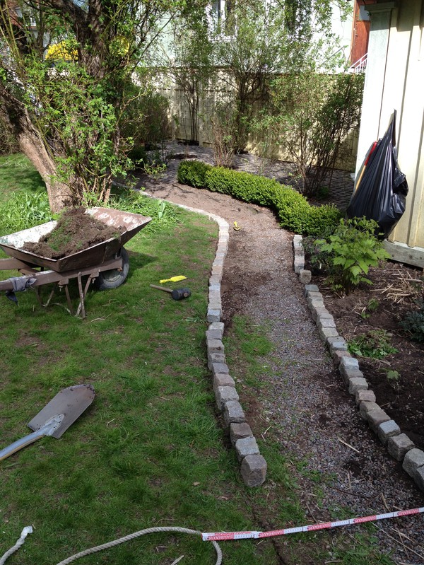 I torsdags var det fint väder och vi kantade in vår trädgårdsstig med gatsten. Jämfört med grannen så har vi nästan inget gräs kvar på gräsmattan, men Sander spelar massor med fotboll där och det är ju därför vi har den, så att barnen kan slita ner den medans de leker.