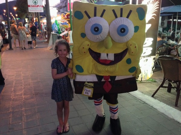 Bara ett stenkast därifrån stod en stackare i Svamp-Bob-fyrkant-dräkt i 30 gradig värme. Signe skrämde nästa slag på honom då hon kastade sig över honom och kramade för allt hon var värd och sedan krävde ett foto.