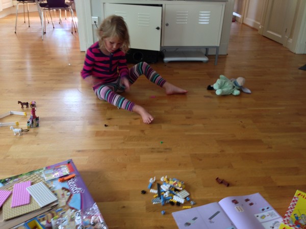 Vi byggde Lego, sen lekte vi med det nybyggda, fikade och tog födelsedagsglass. Och jag undrar alltid när jag ser min dotter i sin hukade ställning, när jag som vuxen västerlänning slutade tycka att det var en vilsam ställning.