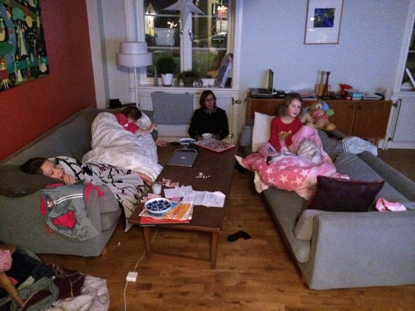 Så här ser det ut på morgonen nu när julkalendern ska tittas på. Alla äter frukost framför tv:n, det är mysigt om än lite kaosartat med alla täcken och filtar ibland.