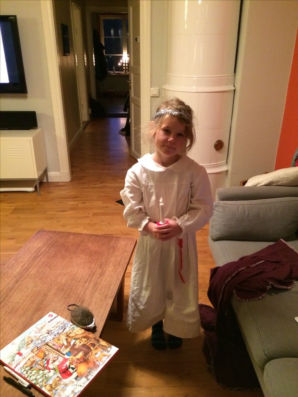 Signe har tagit alla tillfällen i akt att ha på sina luciakläder. Här precis innan jag skulle få besök av målaren som ska måla om nästan hela huset inomhus. Så vi jular så mycket som möjligt för direkt efter trettonhelgen ska allt få sig en ansiktslyftning, och då får det vara slutjulat så att de kommer åt överallt.