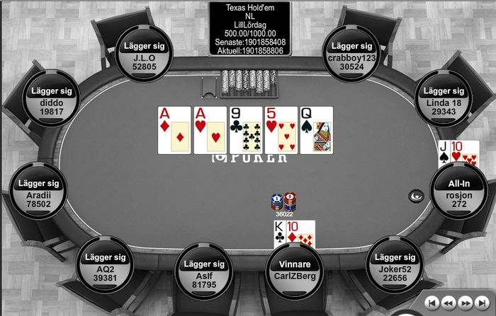 Nästa hand var det Björn som drog ut mig med K8 i spader mot min A9 i klöver trots A och 9 på brädan.