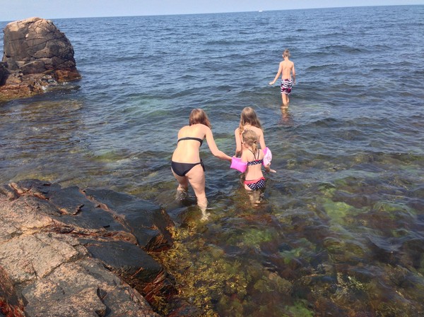 Klart vatten, ganska ok väder, om man hittade lä. Förrädiska havstulpaner när man skulle ta sig upp. Vi tog lunchen på klippan också innan vi badade.