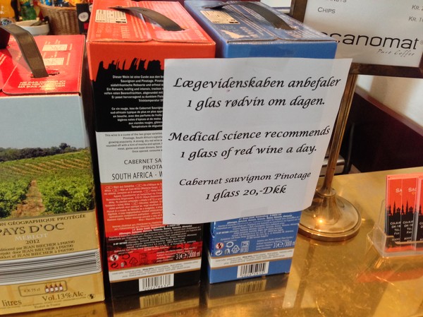 Danskarna har ju lite annan inställning till alkohol, när vi beställde snaps fick vi frågan om vi ville ha "en enkel eller en fornuftig". När vi sedan kom till hotellet hittade jag denna lilla lapp på rödvinsboxen i receptionen. Först läste jag som svensk den inte, mer än första ordet Läkarvetenskapen, tog direkt för givet att det var en varning för att alkohol är farligt och beroendeframkallande, men dagen efter läste jag en gång till. Låter som LCHQ, Low Carb High Quality.