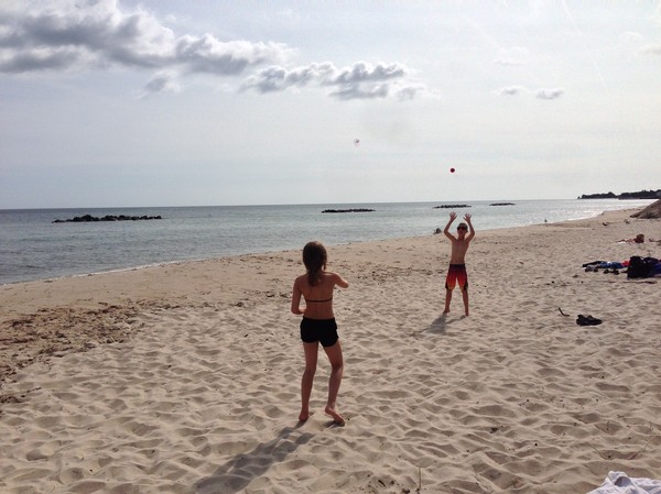 När det är sjukt kallt i vattnet får man roa sig med boll för att värma upp sig och våga sig i. Eftersom Sandskogen i Ystad har en riktigt bra strand funkar det också.