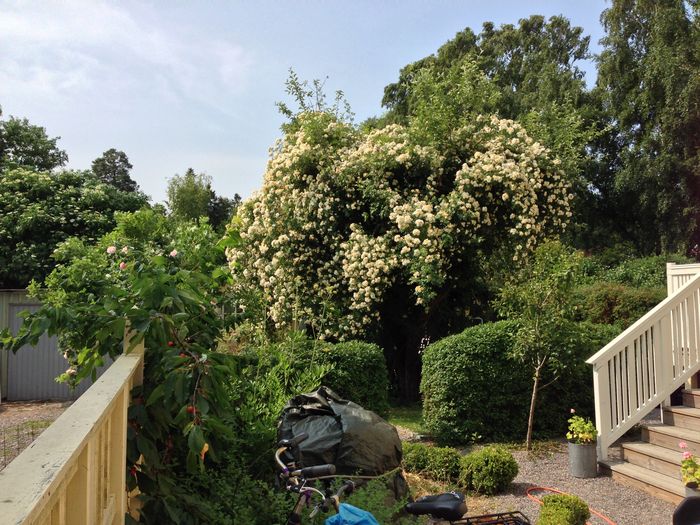 Här hemma handlar det mest om Signes framtand, plocka blåbär, vilken strand vi ska besöka,om att hinna trycka in träning i schemat och om att sitta i trädgården,dofta på rosorna, främst vår gigantiska honungsros som tagit över vårt gamla äppelträd, och läsa Twitter från Vegas.