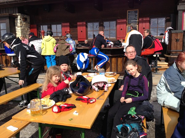 Det som är riktigt mysigt i alperna är de många värdshusen i backarna, god mat, god öl och ganska ok priser faktiskt. Dessutom kunde man sitta och sola samtidigt. Vi åkte hem lite tidigare för vi skulle gå och bada, och efter badet blev det middag hemma i lägenheterna, lagad av min kusin Magnus som är kock.