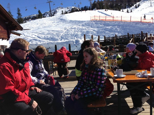 Eftersom tisdagen avslutats med dåligt väder så hade vi våra föraningar om vad som väntade, men inte att det skulle bli så illa som det blev. Hela familjen åkte upp på toppen, men när jag och Signe skulle ta gondolen ner till mittstation på andra sidan, de andra åkte de röda backarna ner, så stängdes liften på grund av hård vind. Det var bara att skynda sig ner till Badgastein igen innan de stängde gondolen på den sidan också. Så jag och Signe fick hålla till i den nedre backen medan de andra trotsade väder och vind. De lyckades till sist ta sig tillbaka så att vi kunde ta lunch ihop, men det blev en blandning av släp och stolsliftar för att ta sig tillbaka.