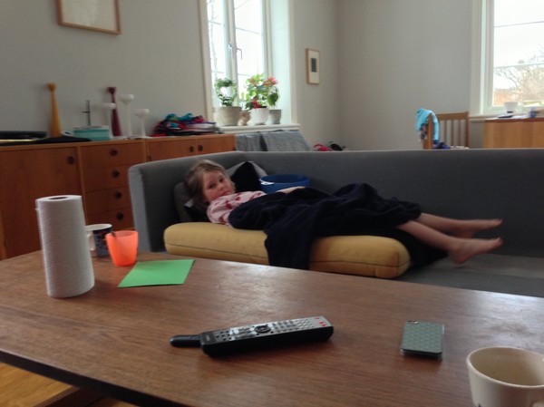 Samtal sent igår eftermiddag - kräkts på dagis. Fortsatte på kvällen hemma, därav att soffklädsel och kuddar saknas i soffan. Nu är det vattenglas som intas skedvis innan jag vet att hon får behålla det hon får i sig. Jobbar hemifrån mellan panikrusningar med skålar.