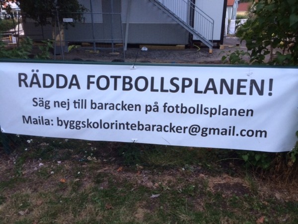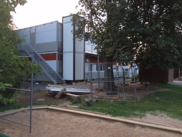 Gigantiska baracker byggda på en lite kaninbursfotbollsplan, två våningar höga. c:a hundratalet barn ska nu gå där med en skolgård som får det att verka som om burhöns har lyxigt gott om yta. Skolförvaltningen i Stockholm verkar vara de enda som inte för flera år sedan förstod att det skulle behövas fler och större lokaler. Istället för skolor med realistiska budgetar har vi fått jobbskatteavdrag. Tack för det Reinfeldt.
