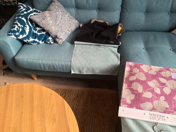 Hittade samtidigt en bild på när vi valde tyg till den nya soffan, på den syns det tyg vi valde och soffan också faktiskt, men vi skippade divanen och körde med en lös fotpall istället, lite mer lätt möblerat. Gissa vilket tyg vi valde