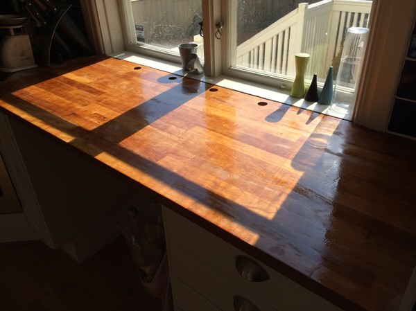Mellan allting har jag också tagit 5 minuter här och där och slipat ner en av våra bänkskivor i köket. Klar idag och lagt på två omgångar olja med lätt slipning emellan. Hinner väl med ett par gånger till innan kväll.
