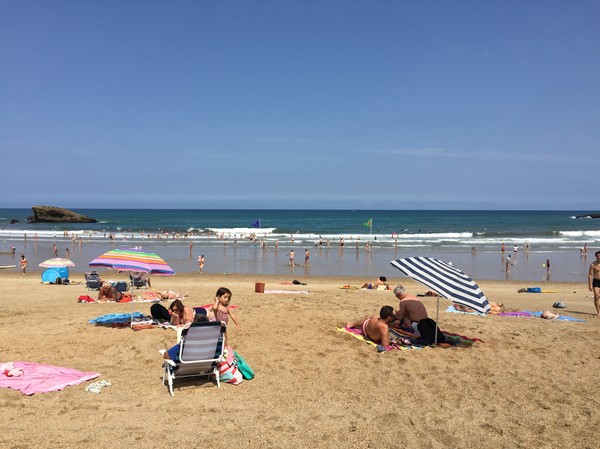Väl hemma fick jag äntligen korka upp min flaska rödvin, införstådd med varför det anses vara nyttigt med minst ett glas rödvin om dagen i det här landet, för att leva här helt nykter frestar på. Andra dagen skulle bli rekordvarm så vi bestämde oss för att åka till Biarritz och Grand Plage, vi bestämde kl 09.30 och kom iväg vid 10.15. Det finns fördelar och nackdelar med att resa med stora tjocka släkten. Blev en aning irriterad, men bestämde mig för att ta nästa bestämda tid med en nypa salt och lite större tålamod. Väl nere vid stranden fanns ett perfekt parkeringshus med gott om plats och vi var snabbt i vattnet. 23-24 grader varmt och nästan lika bra vågor som vid vilken kalifornisk strand som helst, men en betydligt mindre strand. Skillnaden är att det fanns rejält med matställen i närheten, vilket inte alltid är fallet i Kalifornien. Vi badade, jag fick min Café au Lait efter mycket om och men, ungefär samma upplevelse som jag hade när jag beställde vid flygplatsen. Ibland undrar man om de medvetet missdförstår eller om de bara är korkade. Beställde "a partir" men fick först bara en dubbel espresso i min pappersmugg, de vet alltså inte vad au Lait betyder? Fick be dem hälla på mjölk i efterhand "AU LAIT!" Och allt detta går naturligtvis i snigelfart. Men jag ler och ser glad ut, svensk som jag är, och får sedan höra av Liv att de gjorde nästan exakt likadant när hon beställde au Lait.
