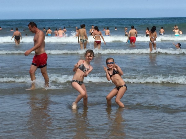 Väl nere påminde den väldigt mycket om en strand nära San Diego som vi besökte med grannarna för tre år sedan, höga klippor på bägge sidor. Skillnaden var att det var högre vågor, bättre än i Hossegor visserligen, och vi blev ihoptryckta på en smal remsa med hundratals andra badande. Så det gick inte att bodysurfa säkert och till och med att bara glida med vågorna garanterade att man var tvungen att väja för någon annan. Trist, men kanske gör de så för att garantera säkerheten. Det är verkligen rejäl kraft i vågorna.