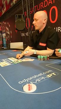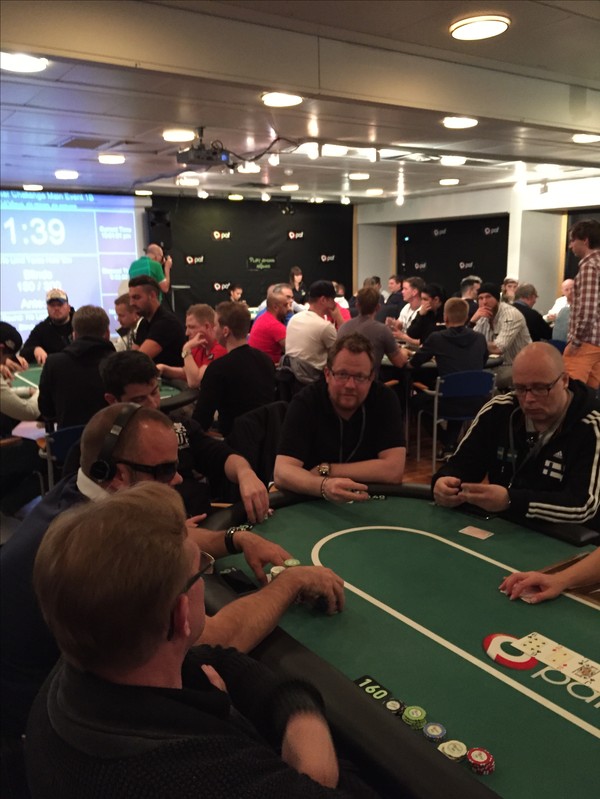 Hamnade på ett bord med många olika nivåer på spelet. Det fanns rutinerade liverävar från Krukan, som har sin egen stil, det fanns en väldigt rutinerad belgiska som åker runt lite varstans i världen och spelar poker. I position på mig satt Dennis Lindmark, som via nätet kvalat in till massor av liveturrar. Belgiskan och Dennis har en stil som är ganska lik min egen, som jag känner igen från nätet, med lite anpassning till live-spel. Fanns dessutom ett par finnar som var helt ok, men de har sin egen stil de med.